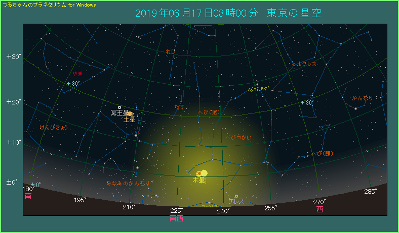 星図の時刻は3時としましたが、東京ではすでに24分前から、空が明るくなり始めています。この時期は思った以上に薄明開始が早いので、気を付けましょう。