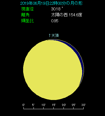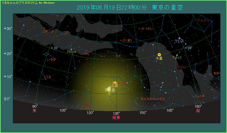 6月19日の夜、月と土星が近づきます。 最も近づくのはお昼の13時ごろですから、今月は条件が良くありません。下の星図は22時ごろに南東方向を見た場合です。月齢16.1という満月を2日過ぎた大きな月が低い位置にあります。土星は月の右上で、間隔は5.4度と開き気味です。