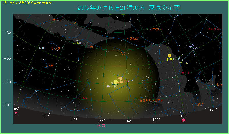 7月16日は月と土星が接近します。 最も接近するのは15時過ぎで、1.9度まで近づきます。星図にある21時ですと、少し間隔が開いて3.0度です。翌日が満月という大きな月が南東の空にあり、土星は月の右上です。