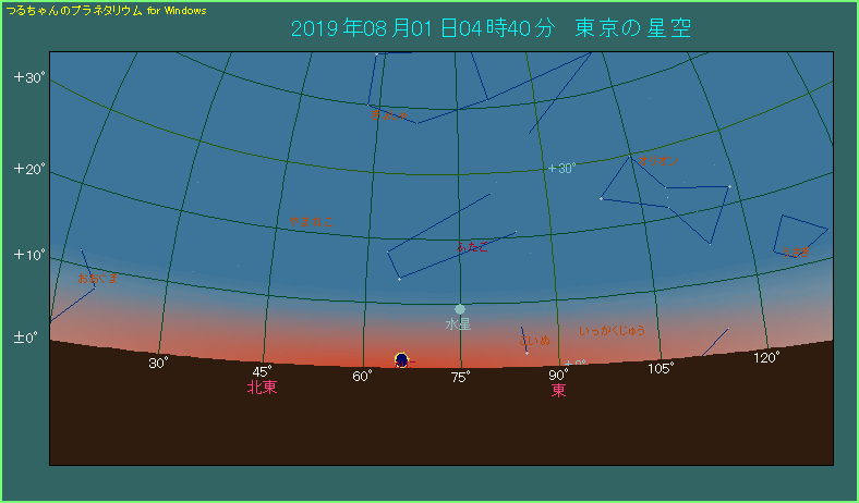 2019年の金星は、8月13日に太陽と同じ方向へやってくる外合となります。したがって金星食から数えて外合まで、たったの12日しかありません。ですから金星の太陽からの離角は3.8度しかなく、必然的に条件が悪くなります。先にも書きましたように日の出直前の出来事となってしまいますし、月齢は29.0ですから新月目前です。月の輝面比は0.00ということで、光っている部分は0.5%もありません。日の出直前にすっかり明るくなった超低空で、糸のように細い月を短時間で見つけられるか怪しいものです。