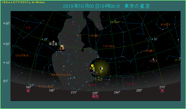 最初は10月3日です。19時ごろ、南西の空をご覧ください。比較的低い位置に月齢4.6という、三日月よりも少し太った月があります。木星はその左側にあり、6.5度離れています。また、月の下方へ6.7度離れたところに、さそり座の赤い1等星アンタレスがあります。3つの天体が緩やかに集まって、にぎやかです。
