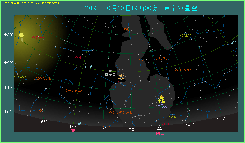 日の入り後、19時ごろに南南西の方角を見上げると、土星があります。星座でいうといて座になり、太い天の川の端に位置しています。0.5等と明るいですし、鈍い黄色で光りますから、すぐに土星とわかります。
