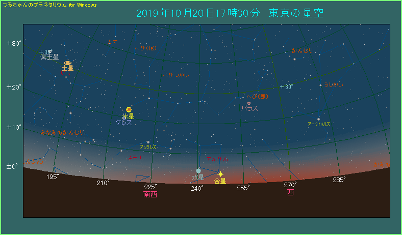 上の星図は、東京で17時30分の場合です。日の入りからまだ30分しかたっていないにもかかわらず、高度は4.5度しかありません。これでは-0.1等の明るさを持つ水星でも、肉眼で観測するのは大変かもしれません。水星から右側へ7.3度離れたところに、非常に明るい金星がありますので、探される際の目印にしてください。