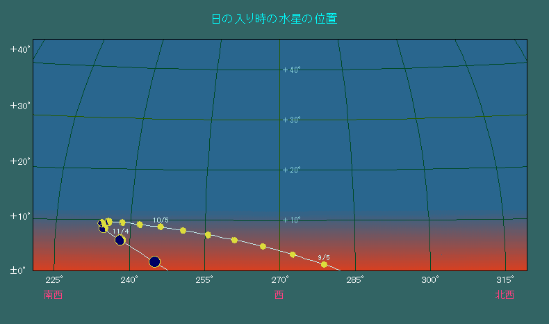 日の入り時刻における水星の位置変化 |