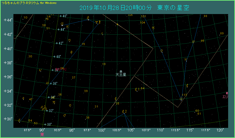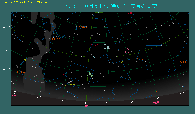 今、天王星はおひつじ座にあります。20時ごろに東の空を見上げましょう。おひつじ座のα星(ハマル、2.0等)からたどるのが良さそうです。天王星はハマルとうお座α星の中間付近に位置しています。拡大図も載せておきましたので、探される際の参考にしてください。