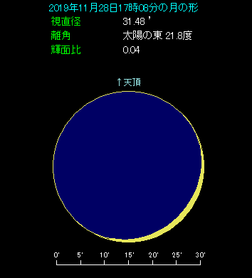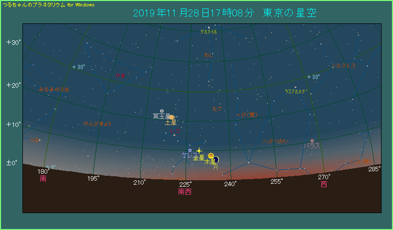 また、月は木星の右下です。木星との間隔は2.2度と、接近状態です。しかし、月齢が1.7と月が細いため、意外と暗くて見づらいでしょう。直径の4%しか光っていないのですから当然です。双眼鏡を用意しておかれた方が無難かもしれません。