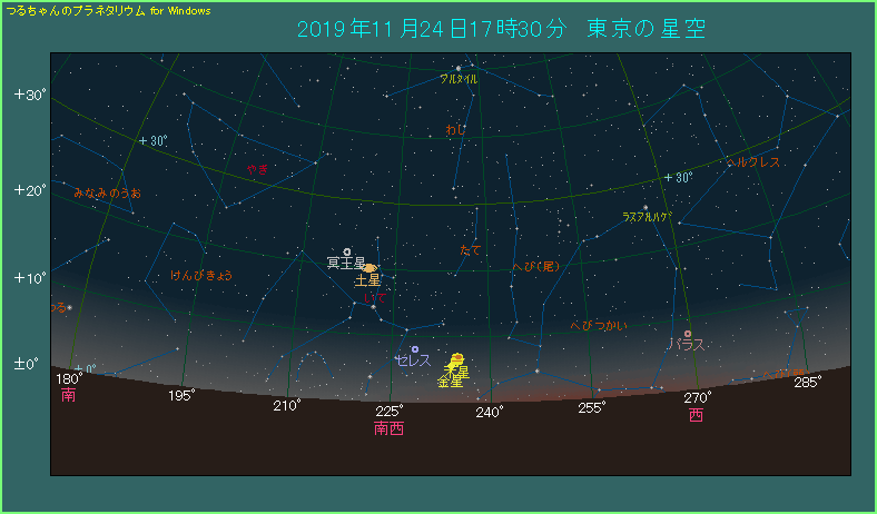 少し薄明が残っている上に、金星の高度は6度もありません。そして36分後に沈んでしまいますから、早いうちにご覧になってください。