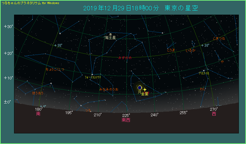 18時ごろ、南西の方角をご覧ください。東京で空が完全に暗くなるのは18時7分ですから、ほぼ暗夜になる時間帯です。月と金星が横に並ぶ格好で3.0度まで接近しています。月齢は3.2で三日月です。金星は