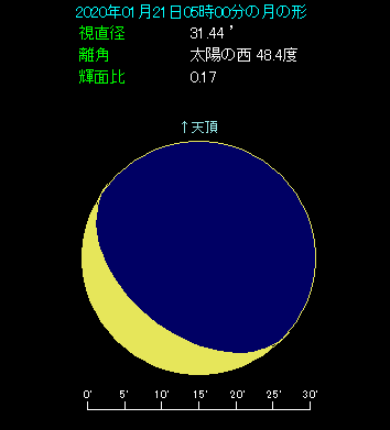 朝の5時ごろ、南東の空をご覧ください。低い位置でまず目にとまるのは、4日後に新月となる月齢25.6という三日月のような月です。その1.8度右側に、赤い色をした火星があります。明るさは1.4等で、火星としては今ひとつさえません。