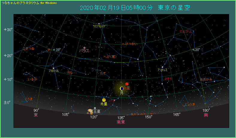 この頃、夜明け前の東天がにぎやかです。月から左下へ12度離れて木星があり、さらに10度離れて土星があります。明日、明後日と、連日月が近づきますので、こちらもお楽しみください。
