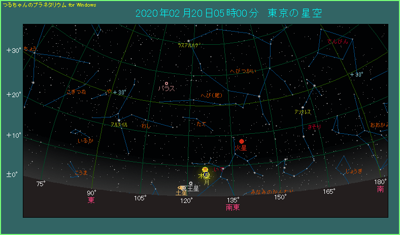 下の星図は朝の5時ごろ、南東方向の様子です。空の低い位置に三日月のような月があり、木星はすぐその上です。両天体の間隔は1.9度と条件の良い接近です。月が満月のようにまぶしくなく、地球照も美しいですから、ぜひご覧になってください。