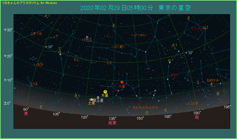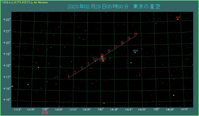 朝5時ごろの拡大図も載せておきました。当日、M22は火星の真下に見えます。観測される際の参考にしてください。