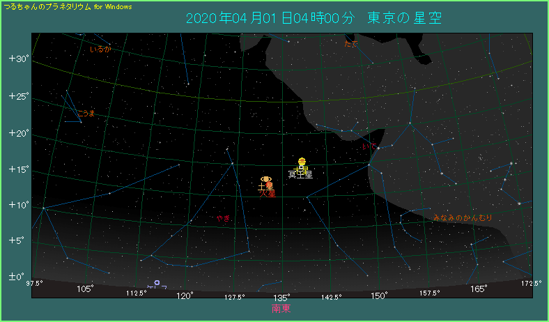 下の星図は朝の4時ごろ、南東方向を眺めたようすです。0.7等の土星と 0.8等の火星が、0.9度の間隔で大接近しています。土星の右側からやや上方へ目をやると、6.3度離れたところに木星もあり、とてもにぎやかです。