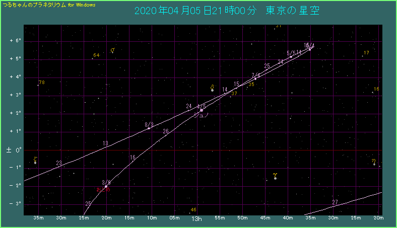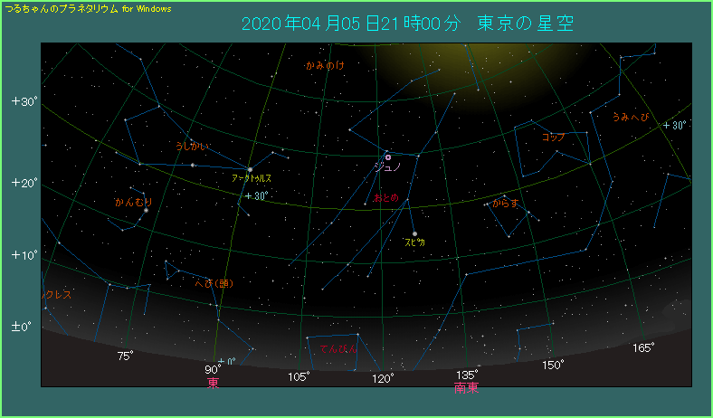 ジュノはおとめ座にあります。δ星(3.4等)が近いですから、この星を目印に探しましょう。10日間隔の位置を示した拡大図も載せておきましたので、一つの目安にしてください。