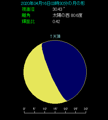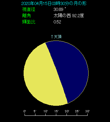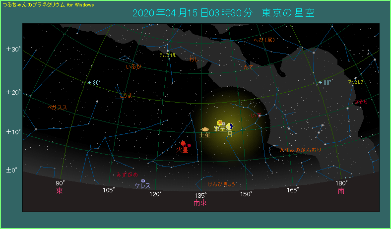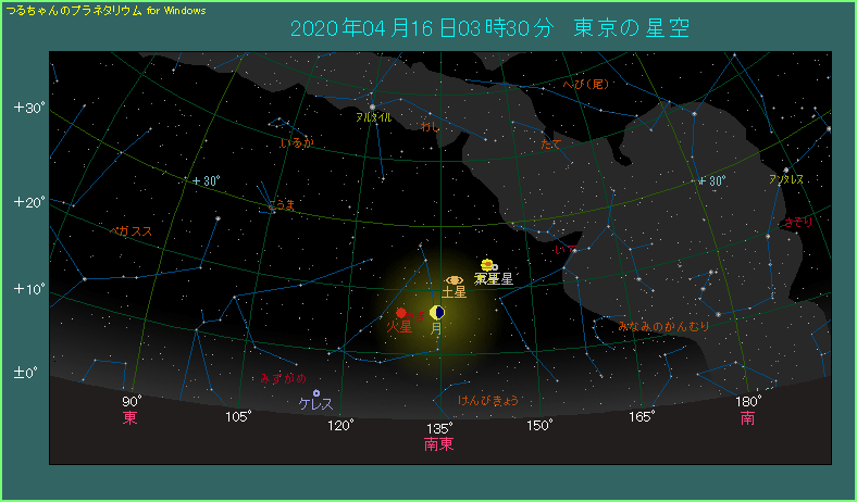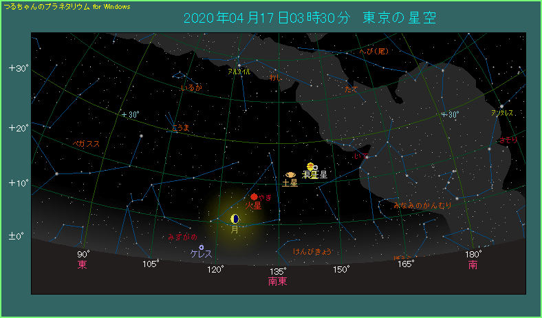 朝の3時半ごろ、南東のやや低い位置をご覧ください。月齢21.4という下弦の月があり、木星に3.6度まで近づいてます。木星の左下には、5.5度離れて土星があり、さらに9.1度離れて火星があります。