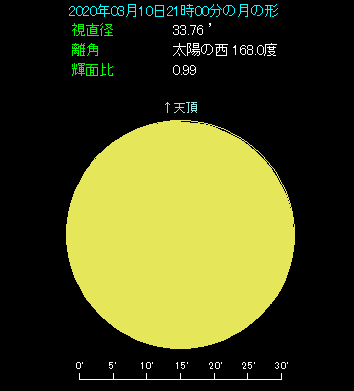 21時に東京から見ると仮定しましょう。4月8日に見られる満月の視直径は 33.72分で、3月10日は
