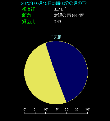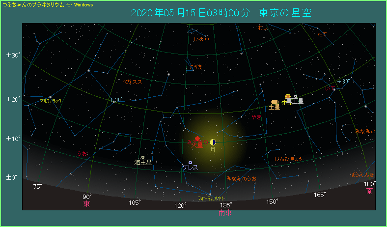 5月15日は月が火星に近づきます。 朝の3時ごろ、南東の空をご覧ください。4時間前に下弦を迎えたばかりの半月が見えます。月の左側、5.5度離れたところに火星があり、両天体が近づいています。先月は木星と土星も近くにありましたが、今月はすっかり離れてしまい、少し淋しくなりました。