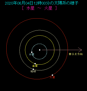 内合とは、金星が太陽と同じ方向に見える位置へやってきて、なおかつ、金星が地球との距離が近い側にあることです。太陽系の図を見ると、太陽、金星、地球がこの順で一直線に並んでおり、内合であることがわかります。