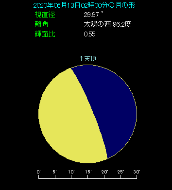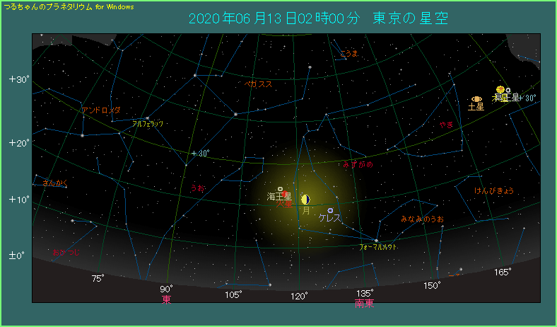 6月13日は月が火星に近づきます。 星図は東京から2時ごろに南東方向を見たようすです。月齢21.0という、13時間半後に下弦となる、半月状の月が見えます。火星はその左側にあります。間隔は5.2度と、やや広い目です。火星は-0.2等とマイナス等級になり、だんだん明るさを増しています。