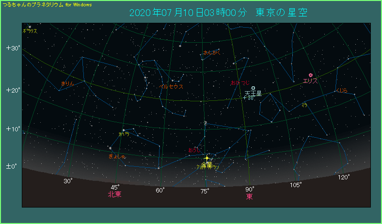 金星の光度曲線を見ると、4月下旬に続いて2度目の山が7月上旬にあります。6月に起こった内合の後、金星が太陽から離れていく過程で、最も明るくなる時期になります。明るさは4月28日にわずかにおよびませんが、四捨五入により4月28日と同じ-4.5等です。普通の1等星よりも5.5等も明るいのですから、その明るさは大変なものです。