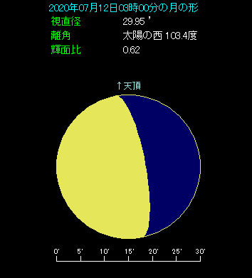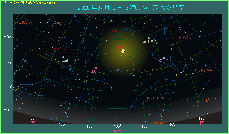 7月12日の早朝は、月と火星が接近します。 3時ごろ、南東の空の中ほどをご覧ください。まず目にとまるのは月齢20.5という、下弦を明日にひかえた月です。月の左上に注意すると、-0.7等で光る、赤くて明るい星が見つかります。これは火星です。両天体の間隔は2.9度と、まずまずの接近です。