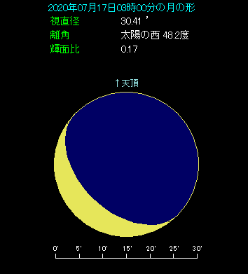 3時ごろ、東の低い位置をご覧ください。-4.5等でひときわ明るく光る金星が目を引きます。ここへ月齢25.5という、4日後に新月をひかえた三日月が近づきます。両天体の間隔は5.9度と、少し広い目です。月の地球照が美しいですから、金星との接近が、さらに印象的なものになります。