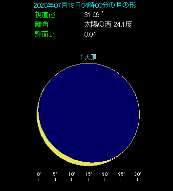 早朝4時ごろ、東北東の低い位置をご覧ください。月齢27.5という三日月よりも一段と細い月が見えます。新月を2日後にひかえており、あと40分で日の出を迎えるような強い薄明の中では、相当見づらいことが予想されます。