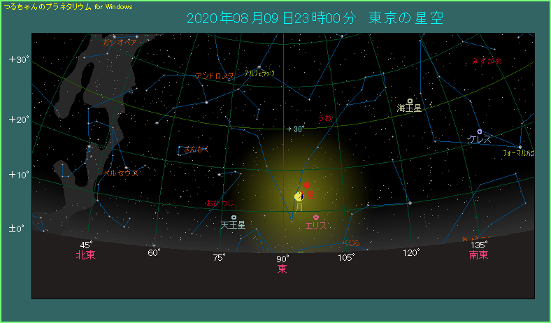 8月9日の遅い時間に月と火星が並びます。 星図は8月9日の23時ごろ、東京から東の方角を眺めた様子です。比較的低い位置に月齢19.9という、3日後に下弦となる月が見えます。火星は月から右上へ3.3度離れたところです。最近は-1.3等まで明るくなっており、赤く光ります。