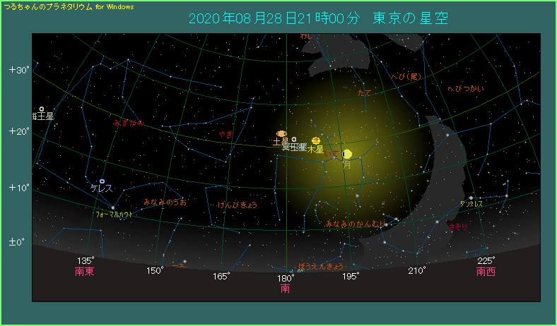 翌日の29日は、月が土星の右下へやってきます。月と土星は4.1度の間隔で並びます。また、月と木星は5.9度で、木星と土星は8.3度です。3天体は今日が一番まとまっています。