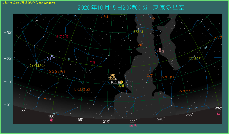 20時頃に南西の空、やや低い位置をご覧ください。周囲に見える星の中で、ひときわ明るく光る木星が見えます。明るさは-2.4等と、相変わらず非常に明るく輝きます。また、23日に同じく東矩となる土星が、左上へ6.5度離れて見えます。