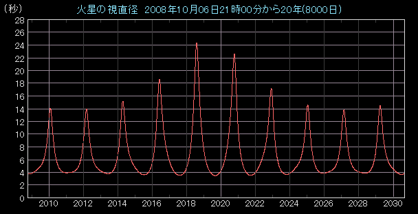 20年間にわたる火星の視直径変化グラフ |
