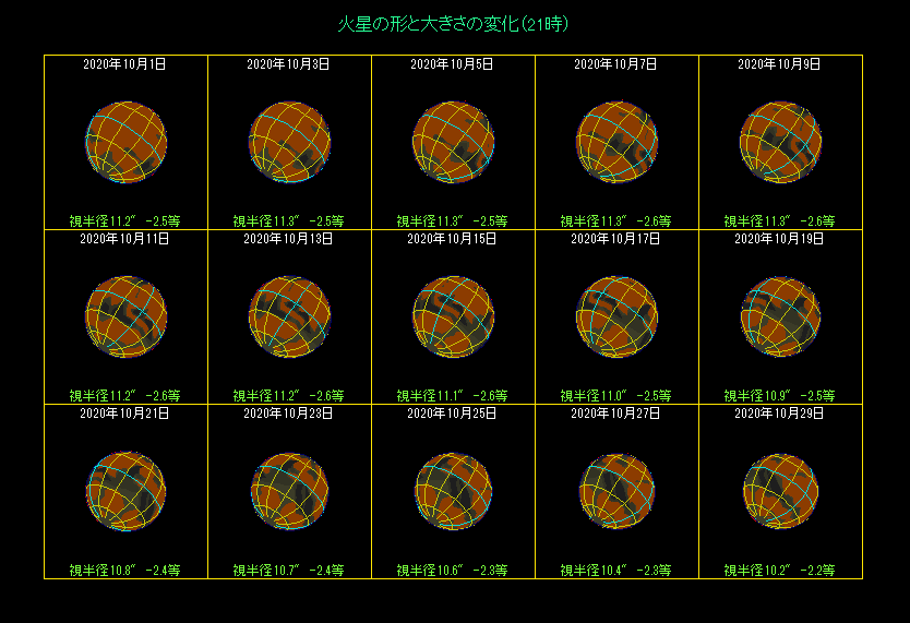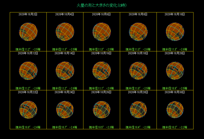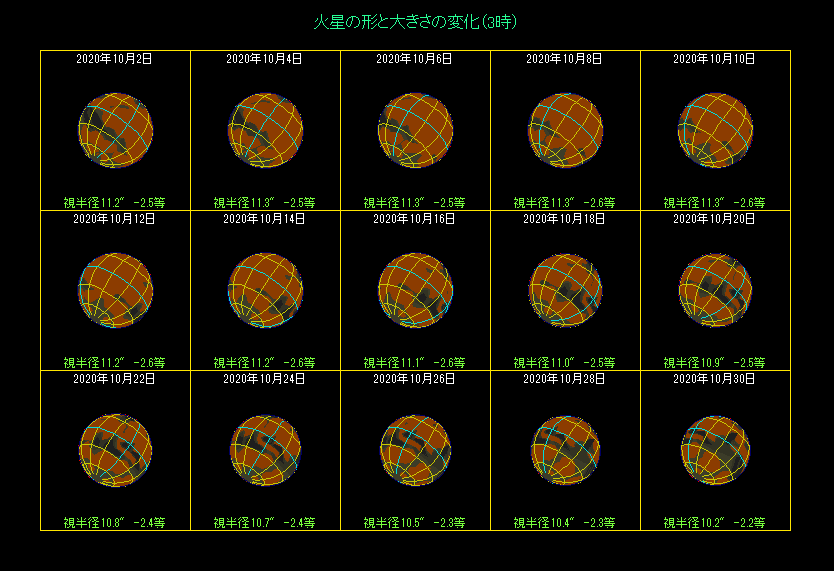 小望遠鏡でも見やすい大シュルティスは、21時に見るなら9月10日と10月21日ごろ。0時なら9月16日と10月26日ごろ。3時なら9月21日と10月31日ごろに、それぞれ見やすくなります。それから今の時期は、南極方向が見やすくなっていますので、小さくなってきた白く輝く南極冠を観測できるでしょう。