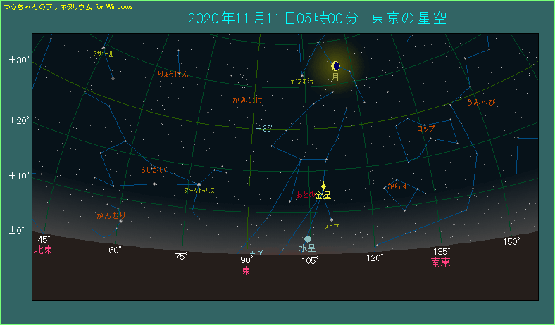 この後は時間の経過とともに、高度が上がってきます。しかし東京では、4時45分から薄明が始まっています。この後はどんどん周囲が明るくなりますから、早い目に見つけてください。1等星スピカとの位置関係も参考にしましょう。
