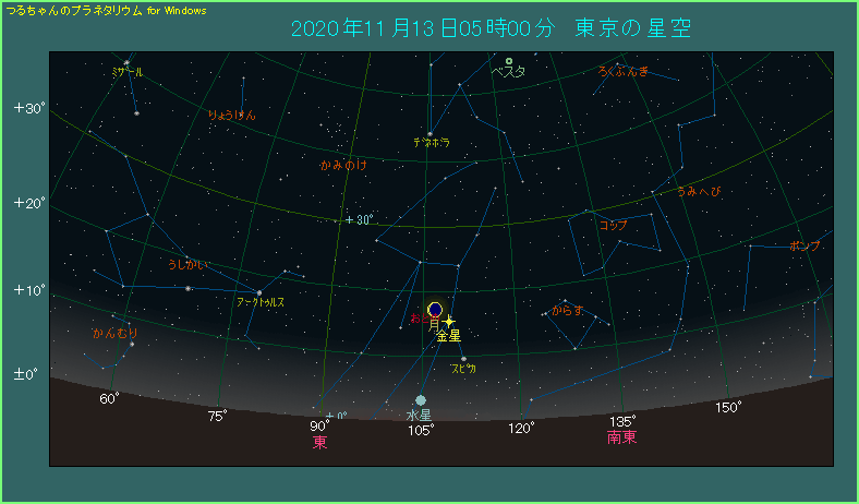 朝の5時ごろ、東の方角をご覧ください。まず目につくのは、非常に明るく輝く金星です。-4.0等ですから、目につくのは当然です。そのすぐ近く、左上にあるのは、2日後が新月という月齢27.0