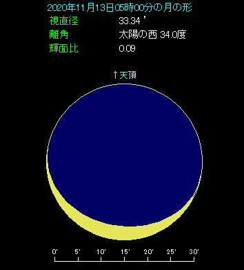 の細い月です。間隔が2.8度と狭い目で、今回は良い条件です。