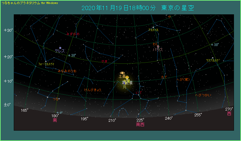 さらに、木星の左上で0等級で光るのは土星です。木星と土星は来月の最接近に向けて、3.5度まで近づいています。また、月と土星は5.5度で、こちらも悪くありません。