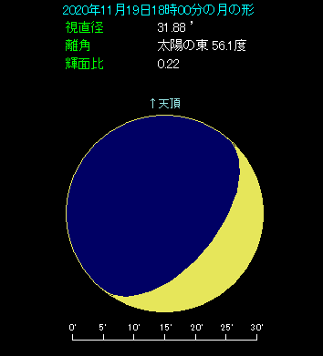 18時ごろ、南西の空をご覧ください。まず目に止まるのは、月齢4.2の三日月よりも少し太った月です。月の右上で金色に光るのは木星です。月との間隔は3.3度で、最近としては間隔が狭くなっています。