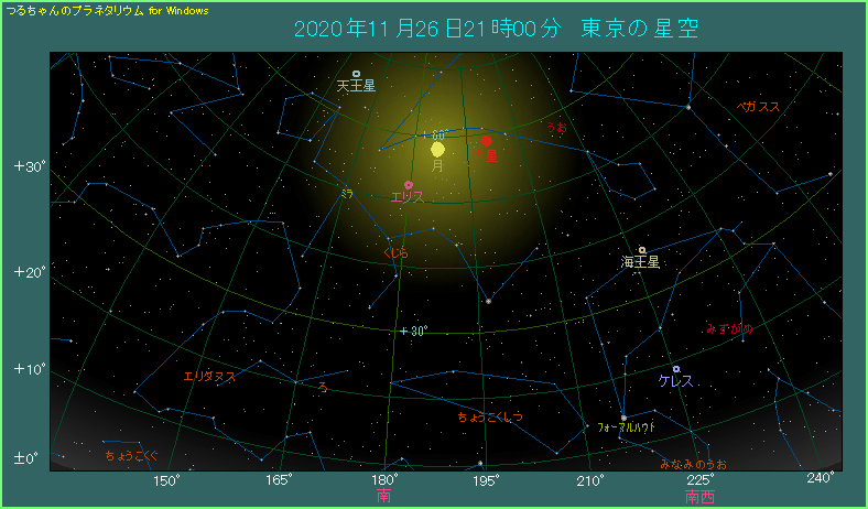 11月26日の夜、月が火星に近づきます。 最も近づくのは26日の8時台です。その関係で、火星が見やすい21時ごろだと、25日と26日の両日が見ごろです。しかし 25日は7.9度、26日は7.4度と間隔が開いてしまいます。 26日の21時ごろに南の空を見上げましょう。見上げるような高い位置に月と火星が横に並んでいます。