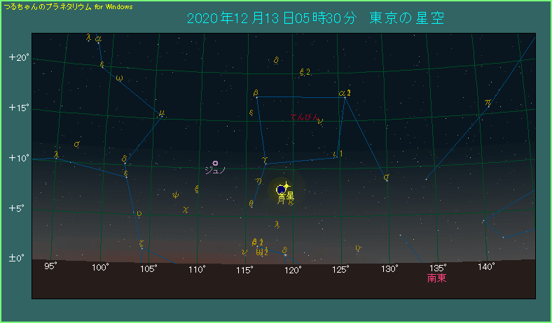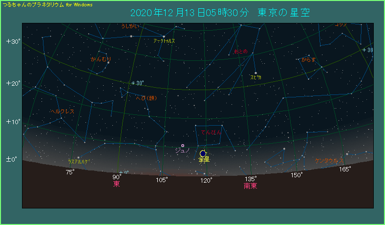 東京では暗夜が終わり、5時10分から周囲が明るくなり始めています。この後も日の出に向けてどんどん明るくなりますから、できるだけ早い目に見ておかれた方が良いでしょう。なお、東京での月の出は4時42分、金星の出も同じ4時42分です。