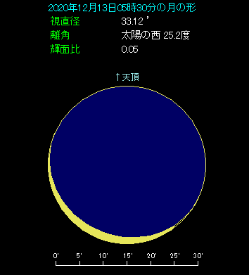 朝の5時半ごろ、東南東の低い位置をご覧ください。とても明るく光る金星が、高度8.2度という低い位置で輝いています。その左下には新月から2日前の細い月が、弱々しく光っています。両天体の間隔は0.7度と1度を切る大接近で、とても美しい眺めとなるでしょう。