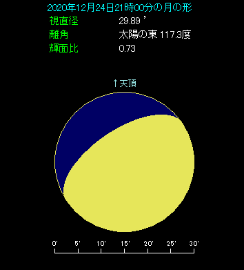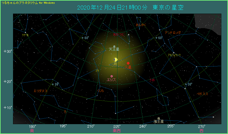 クリスマス・イヴの夜、月と火星が近づきます。 21時ごろ、南東の空の中ほどをご覧ください。月齢9.8の少し丸みを帯びた月が見えます。火星は月の右側にあり、-0.5等で赤く光ります。間隔の方は7.7度と大きく開いています。あまりに開いているので前日はどうかというと、8.0度とますます開いています。