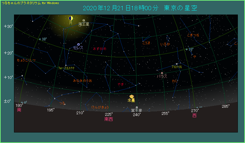 下の星図は12月21日の18時ごろ、東京から眺めた空のようすです。南西の低い位置で木星と土星が重なるように描画されています。