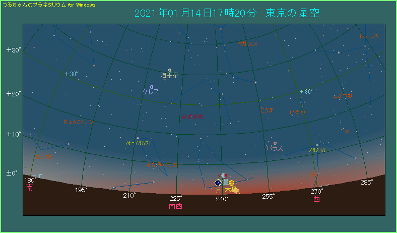 下の星図は東京で日の入りから30分が経過した西南西の空のようすです。月齢は1.1で非常に細く、この時間に肉眼で見るのは無理でしょう。それから最も高度が低いのは土星で、1.3度しかありません。超低空で、条件は最悪です。おまけに薄明が強く残っていますから、全体的に観測は容易でありません。残念ながら、実質的に見るのは難しいかもしれません。