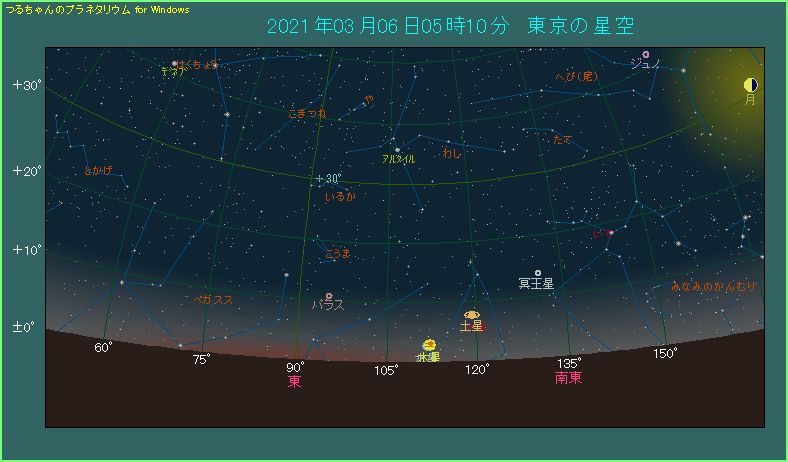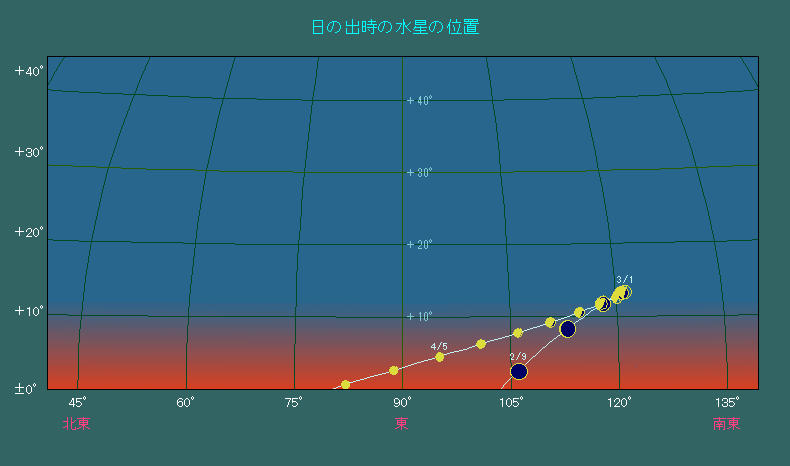 下の星図は東京の日の出から1時間ほど前に、東南東の地平線近くを眺めた様子です。夜明けが近づいており、星図の30分前から空が明るくなり始めています。地平線のごく近くに0.2等の水星があります。もう少し時間がたつと水星の高度は上がりますが、空の方は明るくなります。双眼鏡の助けを借りるなどして、手際よく見つけるようにしましょう。