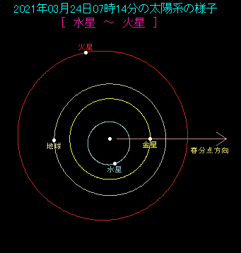 3月24日は地球から金星が太陽と同じ方向に見える合となります。地球軌道の内側を回る金星の場合、合は外合と内合の2種類あります。今回は地球から見た金星が太陽よりも遠い位置で合になりますから、外合になります。