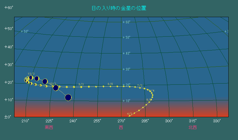 この後の金星は夕方の西空へ移り、宵の明星として輝きます。しかし、今回は高度があまり高くならず、人目につきにくい状態が続きます。