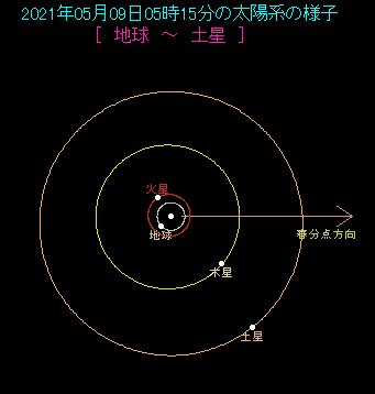 土星は1月24日に合となり、太陽と同じ方向へやってきました。その後は少しずつ太陽から離れており、5月9日は節目となる90度離れた位置にやってきます。太陽系の図を見ると、太陽、地球、土星をこの順に結んだ直線のなす角度が90度になっています。