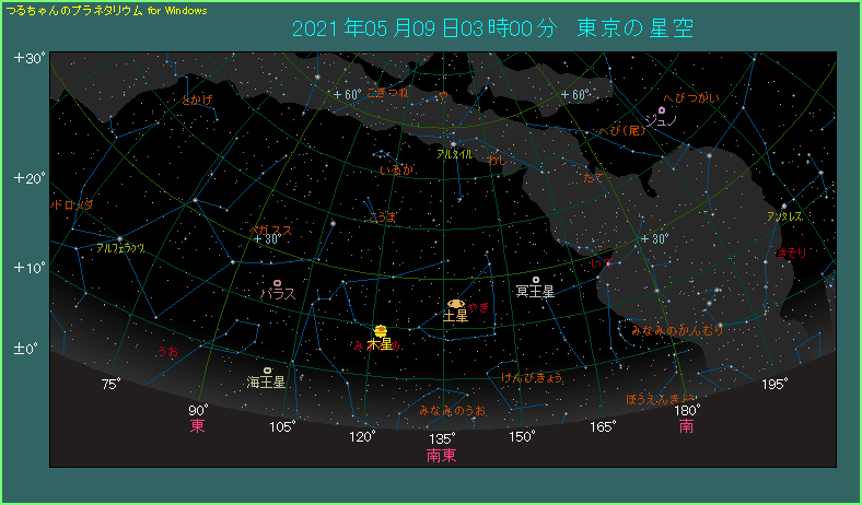 5月9日は土星が西矩となります。西矩とは惑星が太陽から西側へ90度離れることです。