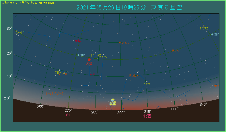 下の星図は5月29日の夕方、太陽が沈んでから40分後のようすです。非常に明るい金星の左下に水星があります。最も接近するのは12時ごろで、0.4度まで近づきます。しかし、星図の時間帯は0.5度と、少しだけ間隔が開いています。