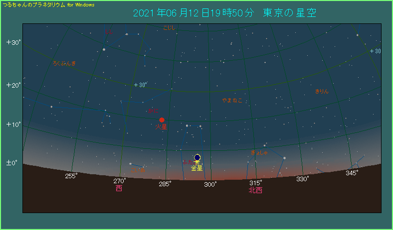 下の星図は東京で19時50分ごろ、西北西の方角を眺めたようすです。19時50分といえば、日の入りから53分が経過しています。しかし空が完全に暗くなるのは、49分後です。